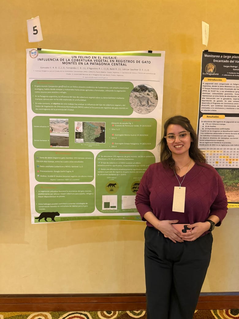 Durante su participación, la becaria también presentó un póster científico titulado “Influencia de la cobertura vegetal en los registros fotográficos de gato montés en la provincia del Chubut”*, que aporta información valiosa sobre los factores ambientales que inciden en la observación y conservación de esta especie.